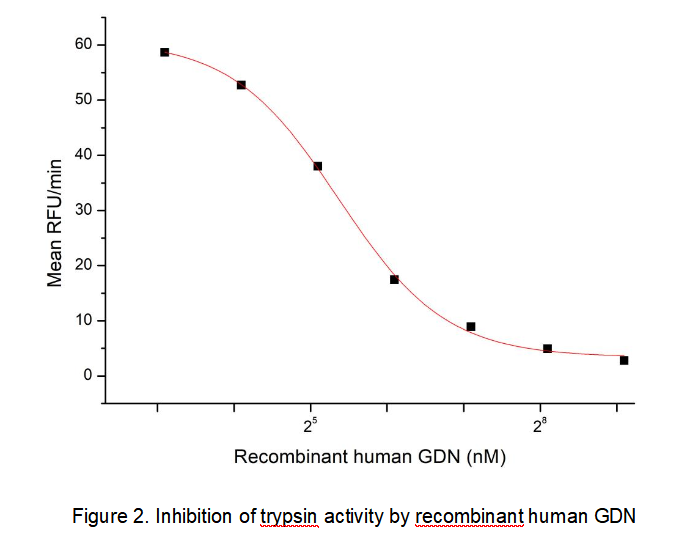 Glia-Derived Nexin (GDN), also known as?protease nexin-1 (PN-1), is a serine protease inhibitor secreted by glial cells. It belongs to the?serpin superfamily?and plays a crucial role in regulating extracellular proteolysis, particularly by inhibiting?thrombin?and?plasminogen activators. GDN is involved in?neurite outgrowth, synaptic plasticity, and tissue repair, making it important in?nervous system development and neuroprotection. Studies suggest its role in?preventing excessive proteolytic activity?that could damage neural networks. The activity of recombinant human GDN was measured by its ability to inhibit trypsin cleavage of a fluorogenic peptide substrate Mca-RPKPVE-Nval-WRK(Dnp)-NH2 in the assay buffer 50 mM Tris, 10 mM CaCl2, 150 mM NaCl, 0.05% (w/v) Brij-35, pH 7.5. Trypsin was diluted to 50 ug/ml in the assay buffer and 25 ul different concentrations of recombinant human GDN (MW: 45.7 KD) was incubated with 25 ul diluted trypsin at 37 ℃ for 30?minutes. Loading 50?μL of the incubated mixtures which were diluted five-fold in assay buffer into empty wells of a plate, and start the reaction by adding 50?μL of 20?μM substrate. Include a substrate blank containing 50?μL of assay buffer and 50?μL of 20?μM substrate. Then read at excitiation and emission wavelengths of 320 nm and 405 nm, respectively, in kinetic mode for 5 minutes. The result was shown in Figure 1 and it was obvious that recombinant human GDN significantly decreased trypsin activity. The inhibition IC50 was <42 nM.