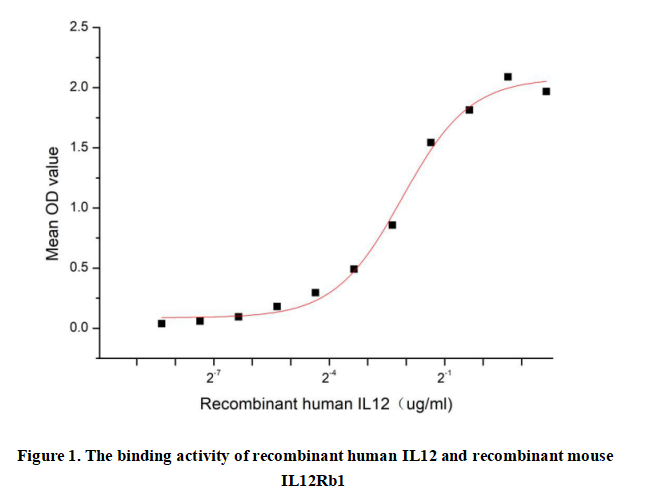 Interleukin 12 (IL12) is a heterodimeric cytokine composed of p35 (IL12A) and p40 (IL12B) subunits, primarily produced by dendritic cells, macrophages, and B cells. It plays a critical role in bridging innate and adaptive immunity by promoting Th1 differentiation, enhancing IFN-γ production, and stimulating NK and T cell cytotoxicity. IL12 is pivotal in anti-tumor and anti-infectious responses but dysregulation can contribute to autoimmunity.IL12 binds IL12Rb1 (a subunit of IL12 receptor) with high affinity, initiating JAK-STAT signaling.Thus a functional binding ELISA assay was conducted to detect the interaction of recombinant human IL12 and recombinant mouse IL12Rb1 .Briefly, biotin-linked IL12 were diluted serially in PBS, with 0.01% BSA (pH 7.4). Duplicate samples of 100μl were then transferred to IL12Rb1-coated microtiter wells and incubated for 1h at 37℃. Wells were washed with PBST 3 times and incubation with Streptavidin-HRP for 30min, then wells were aspirated and washed 5 times. With the addition of substrate solution, wells were incubated 15-25 minutes at 37℃. Finally, add 50μl stop solution to the wells and read at 450nm immediately. The binding activity of IL12 and IL12Rb1 was shown in Figure 1, the EC50?for this effect is 0.23ug/mL.