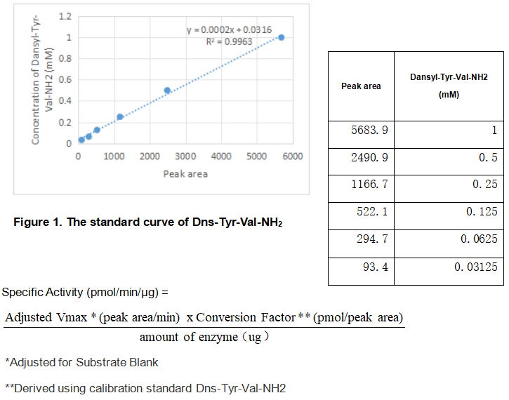 Peptidyl-glycine alpha-amidating monooxygenase(PAM) is an enzyme that is required for the biosynthesis of many signaling peptides. It has two enzymatically active domains with catalytic activities - peptidylglycine alpha-hydroxylating monooxygenase (PHM) and peptidyl-alpha-hydroxyglycine alpha-amidating lyase (PAL). These catalytic domains work sequentially to catalyze neuroendocrine peptides to active alpha-amidated products. A typical activity assay using Dns-Tyr-Val-Gly as substrate, thus the recombinant rat PAM activity was measured by its ability to hydrolyze Dns-Tyr-Val-Gly to Dns-Tyr-Val-NH2. The reaction was performed in 1ml containing 100mM MES/KOH pH 6.0, 30mM KI, 30mM KCl, 1μmol/L cupric sulfate, 100ug/ml catalase, 1% (v/v) ethanol,0.001% (v/v) Triton X-100, 10mM ascorbate ,0.35mM/L Dns-Tyr-Val-Gly(0.2mg/ml) and initiated by addition various concentrations of PAM(0.1ug/ml,1ug/ml,5ug/ml). Incubated at 37℃ for 30min, the reaction stopped by addition 6% (v/v)TCA . The product and substrate was detected by RP-HPLC with UV-detection at 280nm, the analyses were performed at 25℃ employing a Agilent ZORBAX Poroshell SB C18 column(9.4×250mm,5μm), the flow rate was 1ml/min. The mobile phase consisited of 100 mM sodium acetate (pH 6.5) and 35min linear gradient of 10-90% acetonitrile. The result was shown in Figure 1. As the Figure 1 shows, after 30min later, the substrate have been hydrolyzed when the PAM was 5 ug/ml. The retention time of Dns-Tyr-Val-Gly and Dns-Tyr-Val-NH2 is 24.315 and 30.806 respectively. The specific activity of recombinant rat PAM is > 7600 pmol/min/μg.