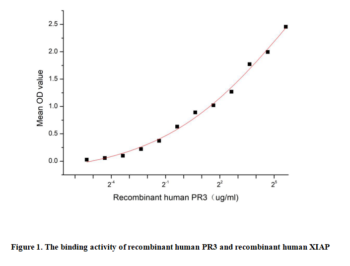 Proteinase 3 (PR3) is a neutrophil-derived serine protease involved in inflammatory and immune responses, as well as the regulation of apoptosis. It contributes to the pathogenesis of autoimmune diseases such as granulomatosis with polyangiitis (GPA), where anti-PR3 autoantibodies (ANCAs) induce neutrophil activation and vasculitis. PR3 modulates immune activity through proteolytic processing of extracellular matrix components and cytokines.Additionally,PR3 cleaves and inactivates XIAP, an anti-apoptotic protein, thereby promoting apoptosis and enhancing cellular sensitivity to death signals. This interaction links inflammation to programmed cell death regulation. Thus a functional ELISA assay was conducted to detect the interaction of recombinant human PR3 and recombinant human XIAP. Briefly, PR3 was diluted serially in PBS with 0.01% BSA (pH 7.4). Duplicate samples of 100 μl were then transferred to XIAP-coated microtiter wells and incubated for 1h at 37℃. Wells were washed with PBST and incubated for 1h with anti-PR3 pAb, then aspirated and washed 3 times. After incubation with HRP labelled secondary antibody for 1h at 37℃, wells were aspirated and washed 5 times. With the addition of substrate solution, wells were incubated 15-25 minutes at 37℃. Finally, add 50 μL stop solution to the wells and read at 450/630nm immediately. The binding activity of recombinant human PR3 and recombinant human XIAP was shown in Figure 1, and this effect was in a dose dependent manner.