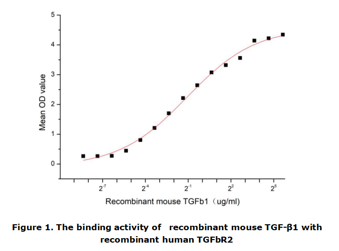 TGF-β1(Transforming growth factor beta 1) is a multifunctional set of peptides that controls?proliferation,?differentiation, and other functions in many cell types.?Transforming Growth Factor Beta Receptor II (TGFbR2) can bind TGF-β1 to initiate SMAD signaling.?Thus we have conducted a binding ELISA assay to detect the interaction of recombinant mouse TGF-β1 with recombinant human TGFbR2. Briefly, TGF-β1 were diluted serially in PBS, with 0.01%BSA (pH 7.4). Duplicate samples of 100ul were then transferred to TGFbR2-coated microtiter wells and incubated for 2h at 37°C. Wells were washed with PBST and incubated for 1 h with anti-TGFbR2 pAb, then aspirated and washed 3 times. After incubation with HRP labelled secondary antibody,wells were aspirated and washed 3 times. With the addition of substrate solution , wells were incubated 15-25 minutes at 37°C. Finally, add 50μL stop solution to the wells and read at 450nm immediately.The binding activity of recombinant mouse TGF-β1 with recombinant human TGFbR2 was shown in Figure 1 , the EC50?for this effect is 0.476ug/mL.
